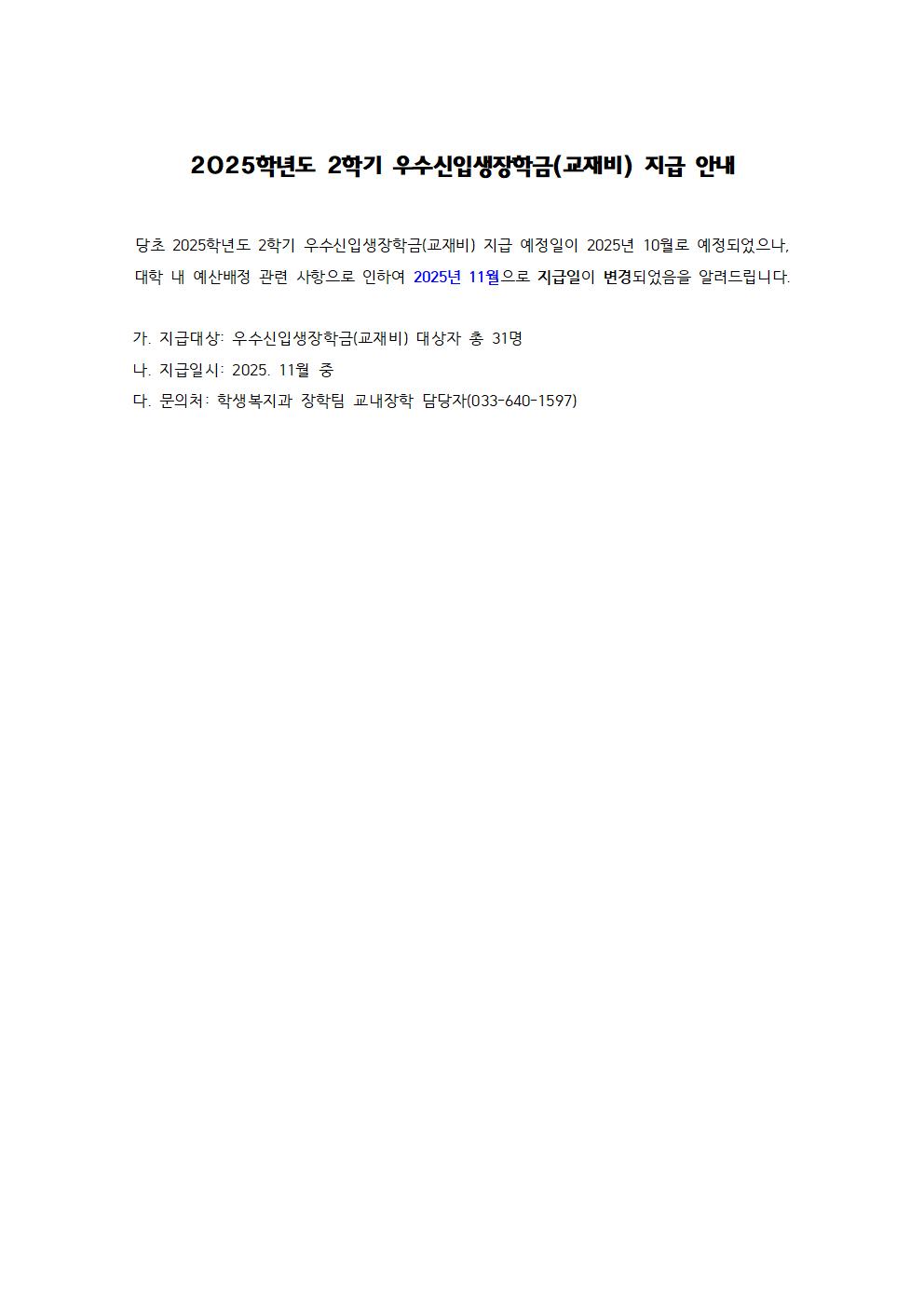 2025학년도 2학기 우수신입생장학금(교재비) 지급 안내