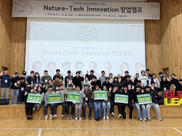 우리 대학 자연기술센터(센터장 박남일)는 강원대학교 KNU창업혁신원(원장 최용석)과 공동 주관으로 ‘제1회 2025년 Nature-Tech Innovation 창업캠프’를 10월 27일(월)부터 28일(화)까지 2일간 태백 중소벤처기업진흥공단 강원연수원에서 성공적으로 개최했다.